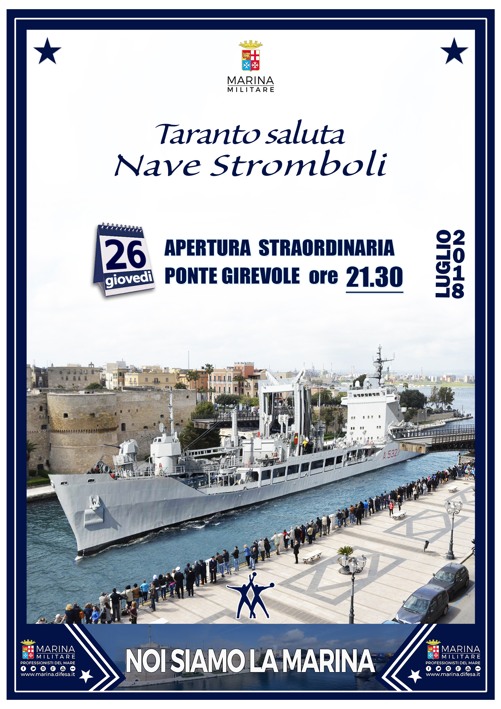 Nuova spettacolare apertura del Ponte Girevole di Taranto. Giovedi 26 luglio transiterà nel Canale Navigabile Nave Stromboli.La Marina Militare Italiana, d’accordo con il Comune di Taranto, continua ad emozionare Taranto e provincia.